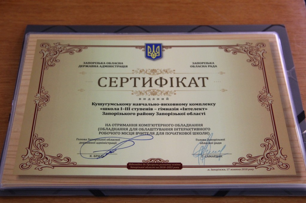 Сертифікати на отримання обладнання для облаштування інтерактивного робочого місця вчителя для початкової школи вручено для: Бердянської гімназії № 3 «Сузір’я», Кушугумського навчально-виховного комплексу «школа І-ІІІ ступенів – гімназія «Інтелект», Більмацької спеціалізованої загальноосвітньої школи І-ІІІ ступенів «Інтелект», Балабинського навчально-виховного комплексу «школа І-ІІІ ступенів – гімназія «Престиж», Костянтинівської спеціалізованої різнопрофільної школи І-ІІІ ступенів «ПРОМЕТЕЙ», Бердянської спеціалізованої школи І-ІІІ ступенів № 16, Орлівської загальноосвітньої школи І-ІІІ ступенів Мелітопольського району, Веселівської районної різнопрофільної гімназії, Великобілозерського навчально-виховного комплексу № 1 (школа – дитячий садок), Юр’ївської багатопрофільної загальноосвітньої школи І-ІІІ ступеня, навчального-виховного комплексу «Дитячий садок – загальноосвітня школа І-ІІІ ступенів» Кам’янки – Дніпровської, Оріхівського навчально-виховного комплексу № 2 імені В. А. Лазаряна, опорного закладу загальної середньої освіти Новозапорізької школи Долинської сільської ради, навчально-виховного комплексу «Джерело» Комишуваської селищної ради, навчально – виховного комплексу «Якимівська гімназія», Оріхівської гімназії № 1 «Сузір’я», опорного навчального закладу «Приазовська спеціалізована школа І-ІІІ ступенів «Азимут» та Якимівської загальноосвітньої школи І-ІІІ ступенів № 2.